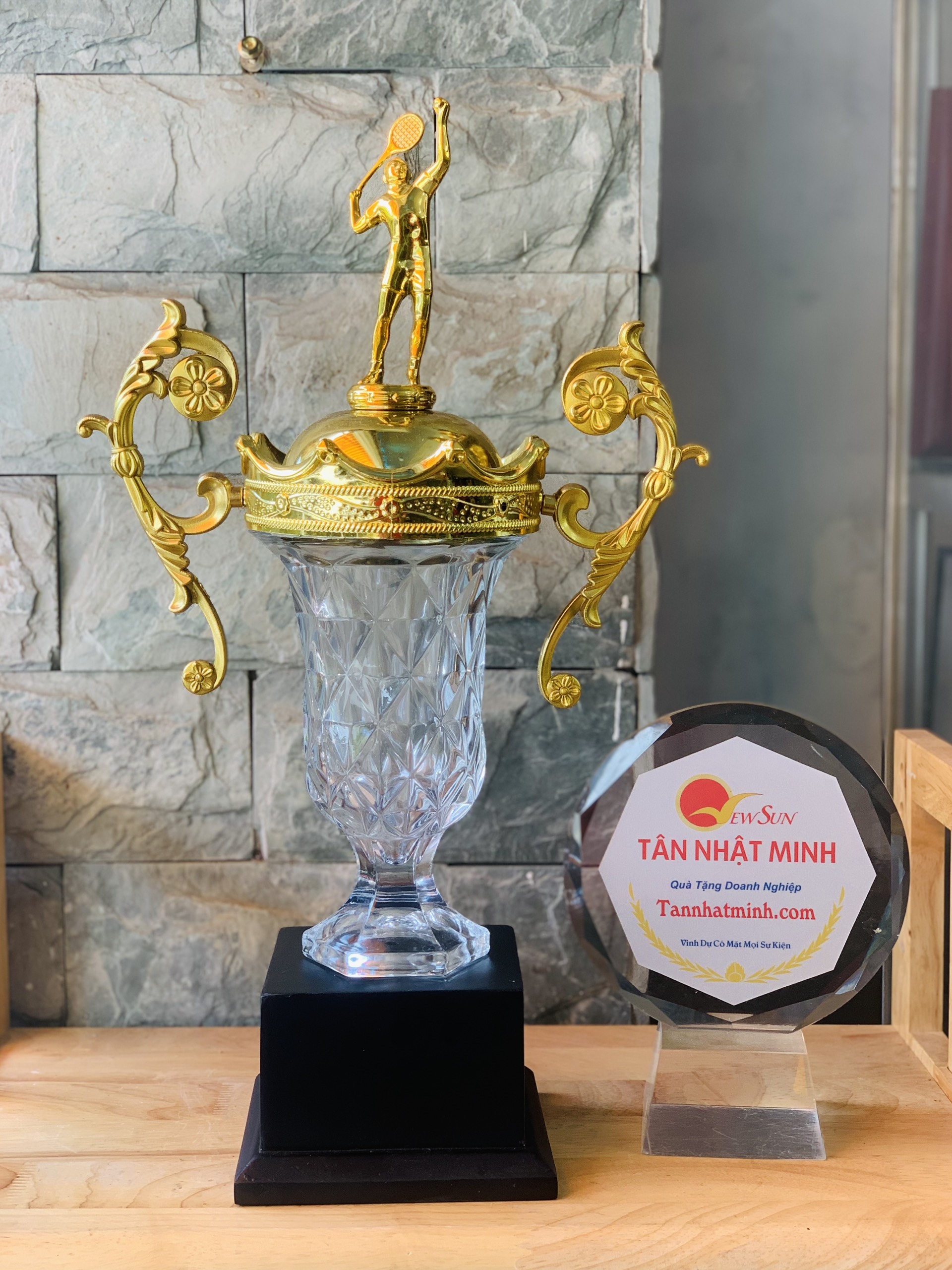 Là những sản phẩm như Pha lê và thủy tinh. Với pha lê chúng tôi nhập phôi pha lê về và chế tác theo yêu cầu. Còn nếu thủy tinh thì ở Việt nam rất nhiều. Tân Nhật Minh tự hào đáp ựng được mọi mẫu mã yêu cầu, cúp pha lê tennis được chế tác trong nước, có thể làm theo mọi hình dạng và kích thước. Linh động trong nội dung và hình thức. Có thể điêu khắc theo bất kỳ hình dạng logo hay hình ảnh nào quý khách muốn.